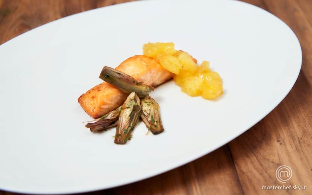 Distribuire i tranci di salmone nei piatti e adagiarvi sopra gli spiccchietti di carciofo e il mango caramellato.