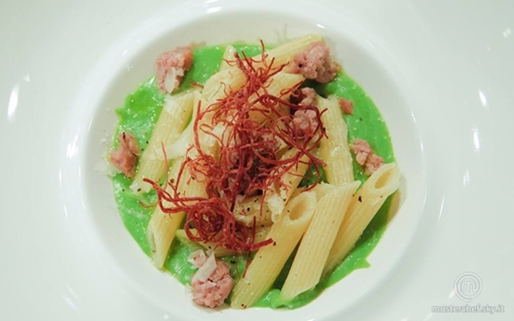 Stendere sul fondo del piatto la crema di piselli e parmigiano e disporvi le penne rigate con la luganega. Guarnire con le scaglie di parmigiano reggiano e gli sfilacci di cavallo.