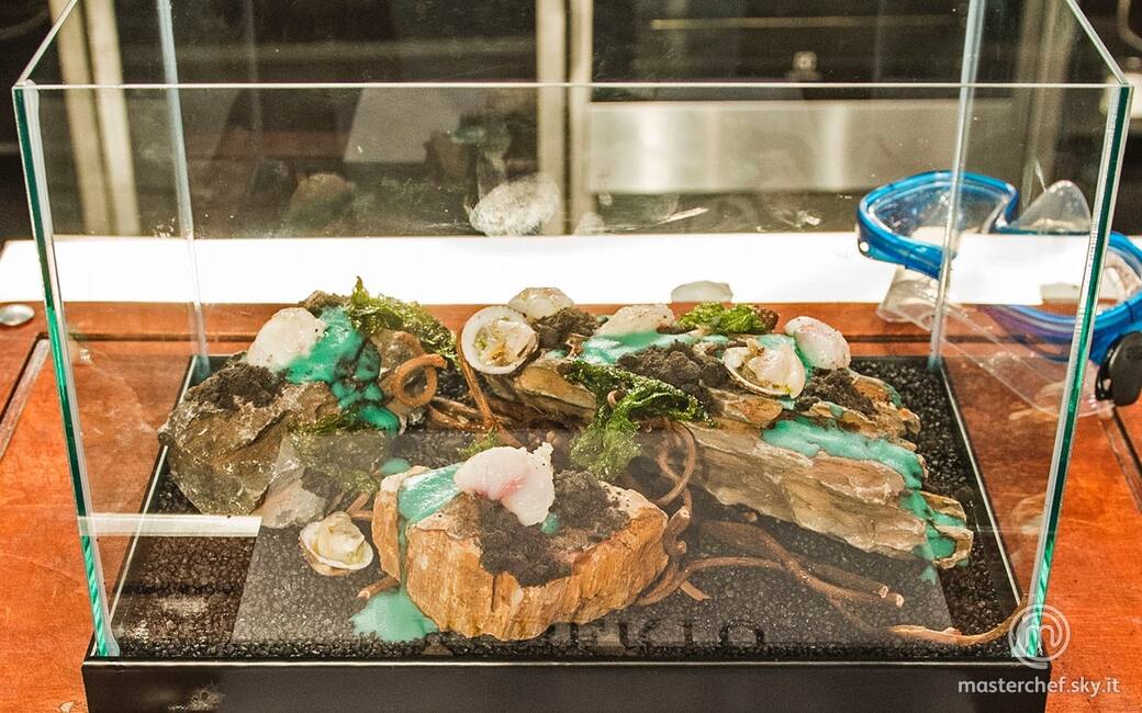 Impiattare in un acquario simulando un fondale marino: disporre la sabbia di pane, i tartufi nella loro conchiglia, i tranci di rana pescatrice e l’alga croccante. Completare con la crema di patate e l’acqua di alga.
