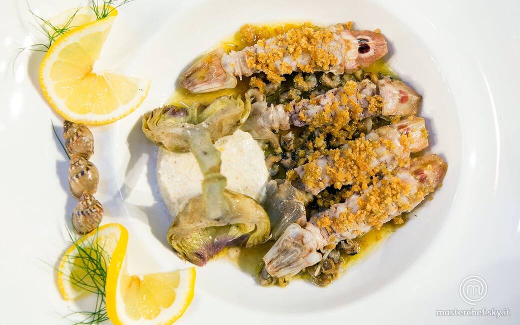 Distribuire il brodo e le lumache nelle fondine, adagiarvi sopra le canocchie e ricoprirle con la panure di pangrattato. Formare di lato un tortino di burrata e disporre sopra il carciofo tagliato a metà per il lungo. Guarnire con alcuni gusci di lumache, fettine di limone e finocchietto.