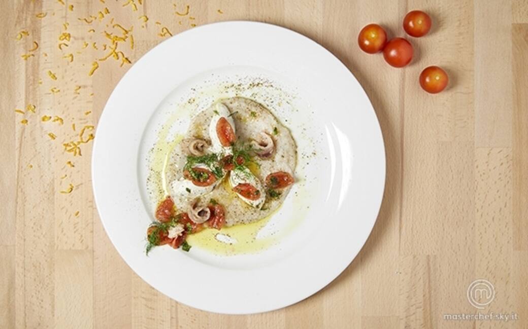In un piatto leggermente fondo fare un letto con la crema di pane, fare delle quenelle con un cucchiaino con la ricotta e aggiungerle sul pane. Appoggiare i petali di pomodoro negli spazi liberi. Prendere i 4 filetti di sarda e arrotolarli. Al centro posizionare un po' di finocchietto fresco.