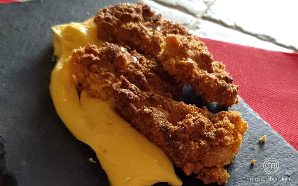 Servire qualche pezzetto di torta su un piattino, accompagnando con qualche cucchiaio di crema pasticcera.
