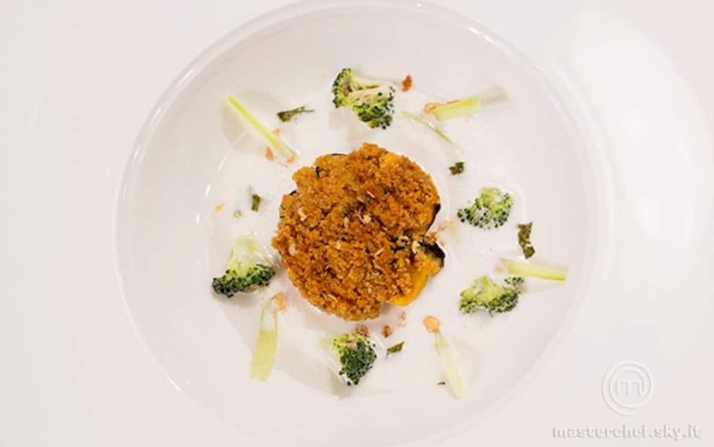 Saltare il pan pesto in padella con aglio e olio. Farlo raffreddare e miscelarlo con origano secco calabrese e creare una panure. Regolare di sale.