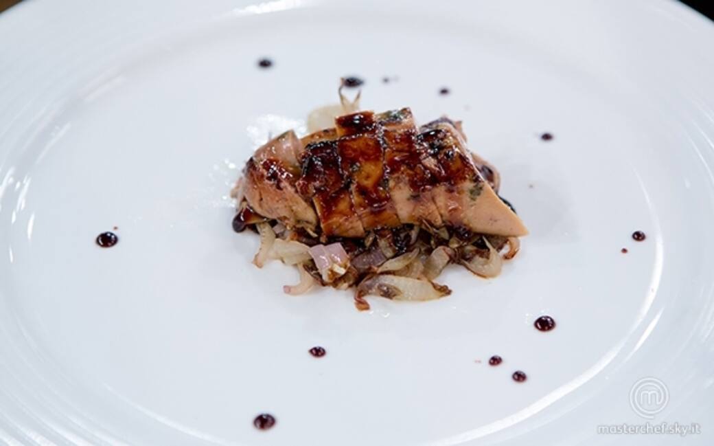Comporre il piatto mettendo l'indivia brasata e sopra la scaloppa di fois gras, condire con il mosto cotto, salare e pepare.