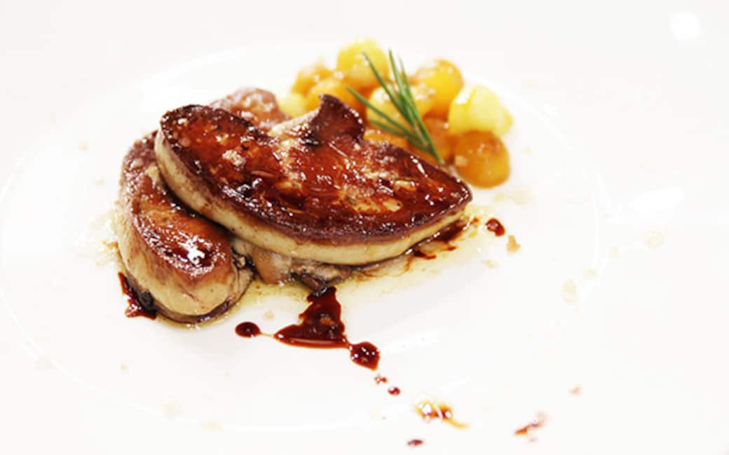 Tagliare il fois gras a scaloppe e abbatterle. Cuocere la scaloppa di fois gras in una padella rovente e unire a fine cottura le buole con la loro salsina.