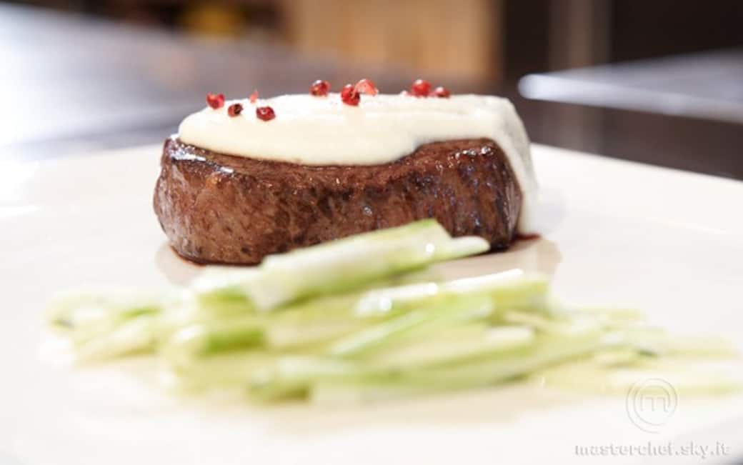 Impiattare: disporre la carne, gli asparagi a lato e versarvi sopra un filo d’olio. Sopra lo scamone mettere la crema al castelmagno. Per dare del colore, finire con dei chicchi di pepe rosa sopra la crema.
