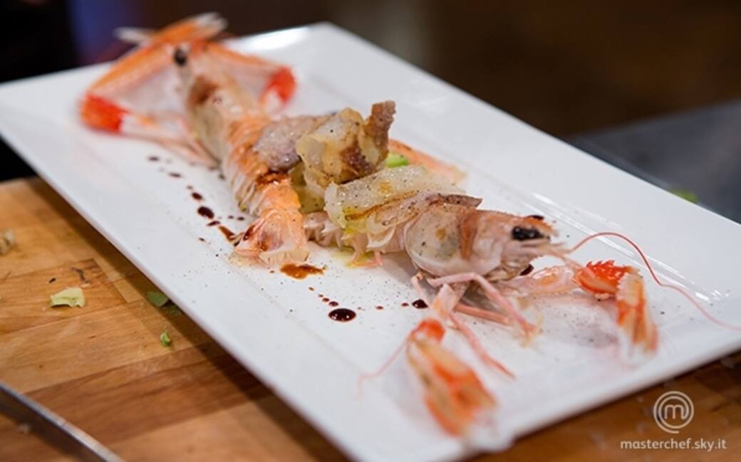 Tagliare il carapace degli scampi, aprirli e cuocerli su una piastra antiaderente.