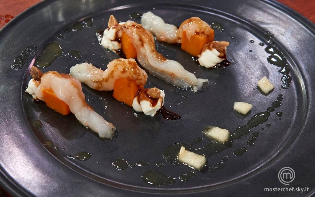 Impiattare disponendo i cubi di carote, gli scampi sopra di essi e delle punte di crema di ricotta con sopra la mandorla tostata. Irrorare con la glassa al caffè e la bisque e disporre dei cubi di pesca nella parte opposta del piatto. Aggiustare di sale.