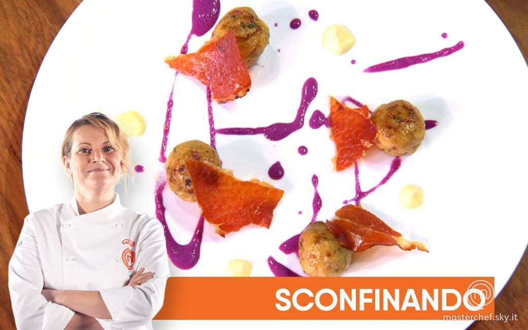 Mettere alla base del piatto qualche striscia di salsa al cavolo viola, i canederli, l’erba cipollina, lo speck, qualche fiore e qualche goccia di senape.