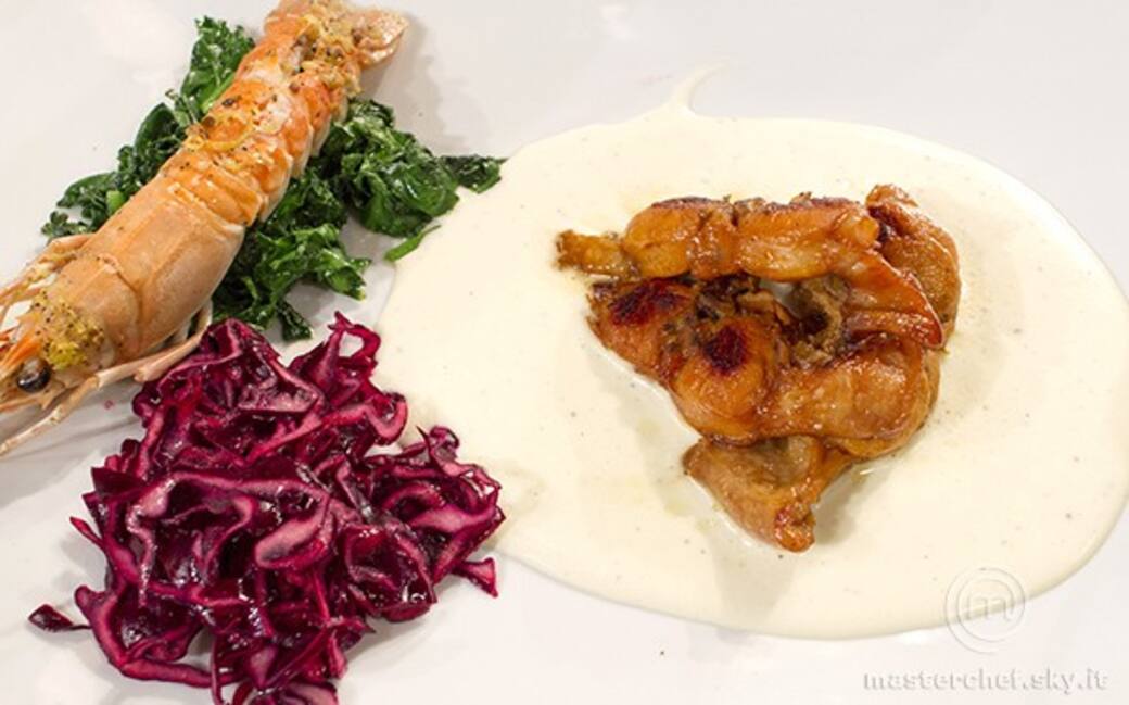 Tagliare finemente il cavolo rosso e fare un'emulsione di olio, sale, limone, pepe, e lasciarlo riposare. Pulire gli scampi e grattugiarci una scorza di limone, olio, timo, mettere del sale e marinarli, poi metterli al cartoccio in forno per 10 minuti.