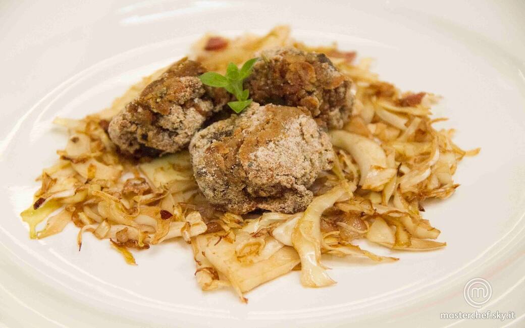 Nel frattempo, pulire il cavolo e tagliarlo finemente. Sciogliere il lardo in una padella con un filo d'olio, aggiungere il cavolo e farlo saltare a fiamma media per alcuni minuti.