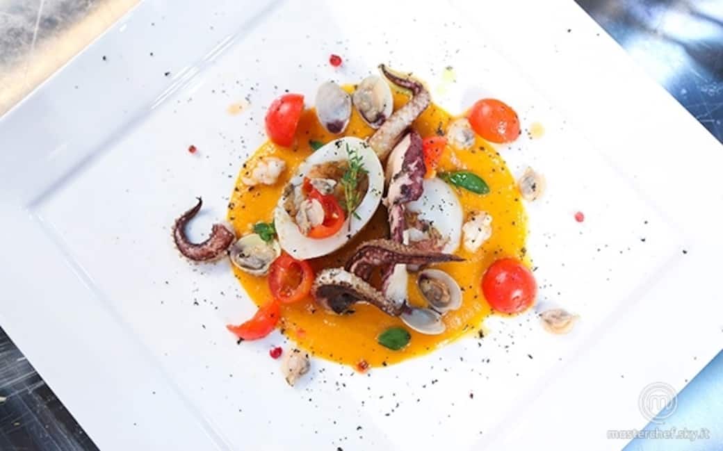 Impiattare ponendo alla base del piatto la crema di peperoni, sopra la seppia tagliata a fette spesse, i tentacoli del polpo, le vongole intorno, lo scampo restante leggermente saltato in padella, decorare con pomodorini a crudo, origano, foglie di timo, la polvere nera e un filo d'olio.