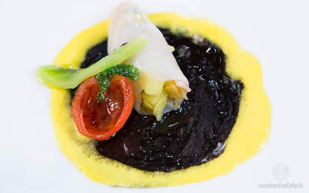 Emulsionare il nero di seppia con poche gocce di olio di oliva, friggere 12 foglie di basilico in olio bollente, tagliare a fette sottili il kiwi. Comporre il piatto poggiando le seppie (tre per piatto) su un disco di nero dei calamari bordato di salsa di peperone gialla. Adagiarvi accanto un pomodorino riempito dalla foglia di basilico e un pezzetto di kiwi.