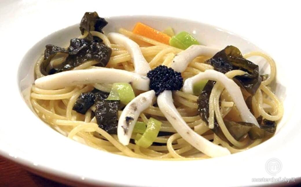 Lavare la seppia. Affettare il porro a rondelle, tagliare la carota e lasciarla soffriggere con un filo d’olio. Unire le alghe kombu, la seppia tagliata e un mestolo di acqua di cottura. Scolare gli spaghetti scanalati e saltarli con gli ingredienti.