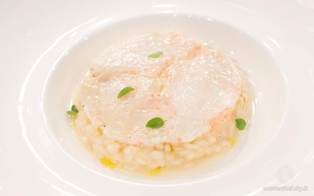 Quando il riso sarà cotto, farlo riposare per qualche minuto. A fuoco spento, aggiungere 30 grammi di burro ghiacciato e mescolare vigorosamente per ottenerne una buona mantecatura. Porre il riso cotto sul fondo del piatto da portata, aggiungere al di sopra il disco di carpaccio di scampo marinato allo zenzero e terminare il tutto con un filo d'olio e qualche fogliolina di maggiorana per guarnire.
