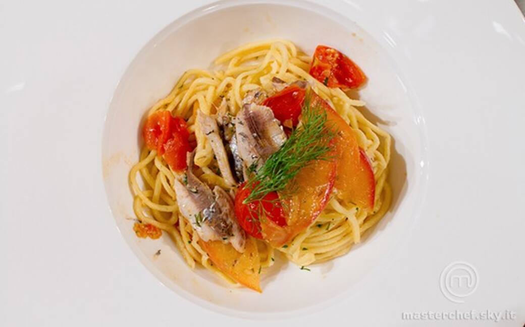 Pulire le sarde, sfilettarle e marinarle con un filo d’olio. Tagliare i pomodorini in quarti e la pesca a fette sottili. Tritare lo scalogno e rosolarlo in padella con un filo d’olio, aggiungere la pesca e proseguire la cottura per un minuto, sfumando con 10 cl di passito.