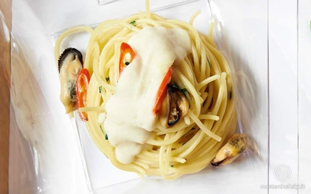 Adagiare la pasta nel piatto formando un nido. Aggiungere le cozze aperte e qualche goccia di crema di cannellini.
