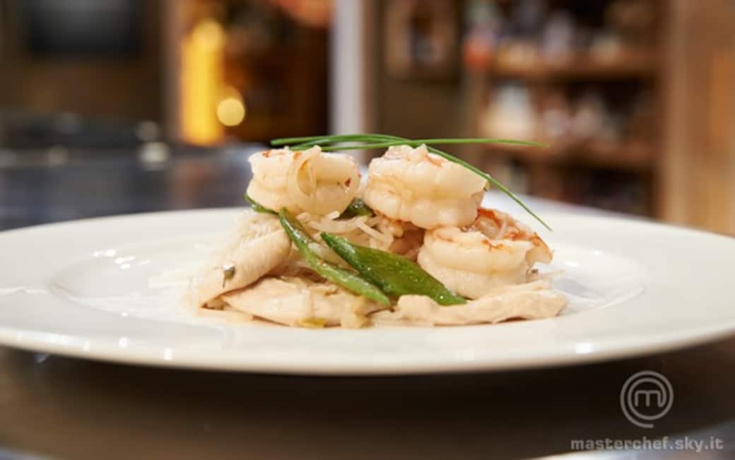 Buttare nell’acqua gli spaghetti di riso. Poco prima della cottura, scolarli e saltarli in padella insieme all’intingolo. Infine aggiungervi i gamberi e un cucchiaio di acqua di cottura. Impiattare e guarnire con dell’erba cipollina.