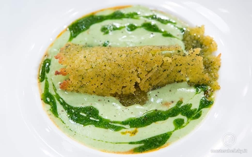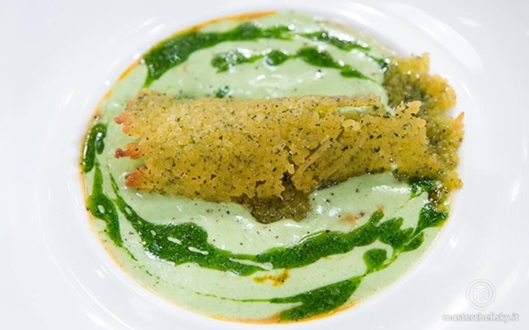 Impiattare posizionando sul fondo di un piatto le lumache sgusciate, aggiungere il loro guazzetto filtrato, coprire con la vellutata di patate, broccoli e stracciatella. Posizionare infine il cannolo/cialda di spaghetti e decorare con il pesto di spinaci.