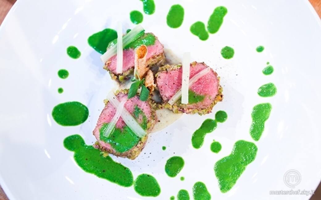 Passare le acciughe nell'uovo quindi nella farina di riso e friggere in olio bollente. Servire il filetto tagliato a rondelle sulla purea condito con verde di bieta, acciughe fritte e gambi di bieta croccanti.