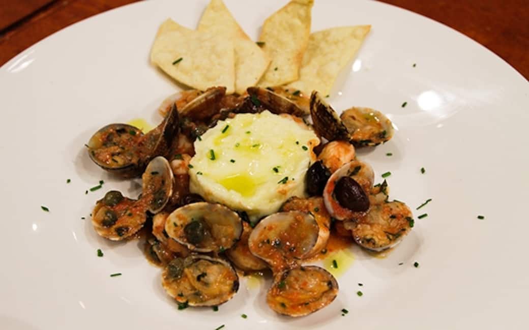 Soffriggere la cipolla tritata con una testa d’aglio. Aggiungere le vongole, i pomodorini frullati, gli aromi le olive e i capperi. Attendere che le vongole si aprano, quindi spegnere il fuoco e lasciare riposare.