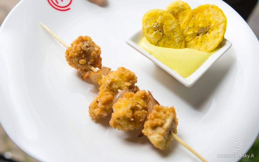 Impiattare gli spiedini e accompagnarli con la maionese e il platano fritto. Aggiustare di sale e pepe.
