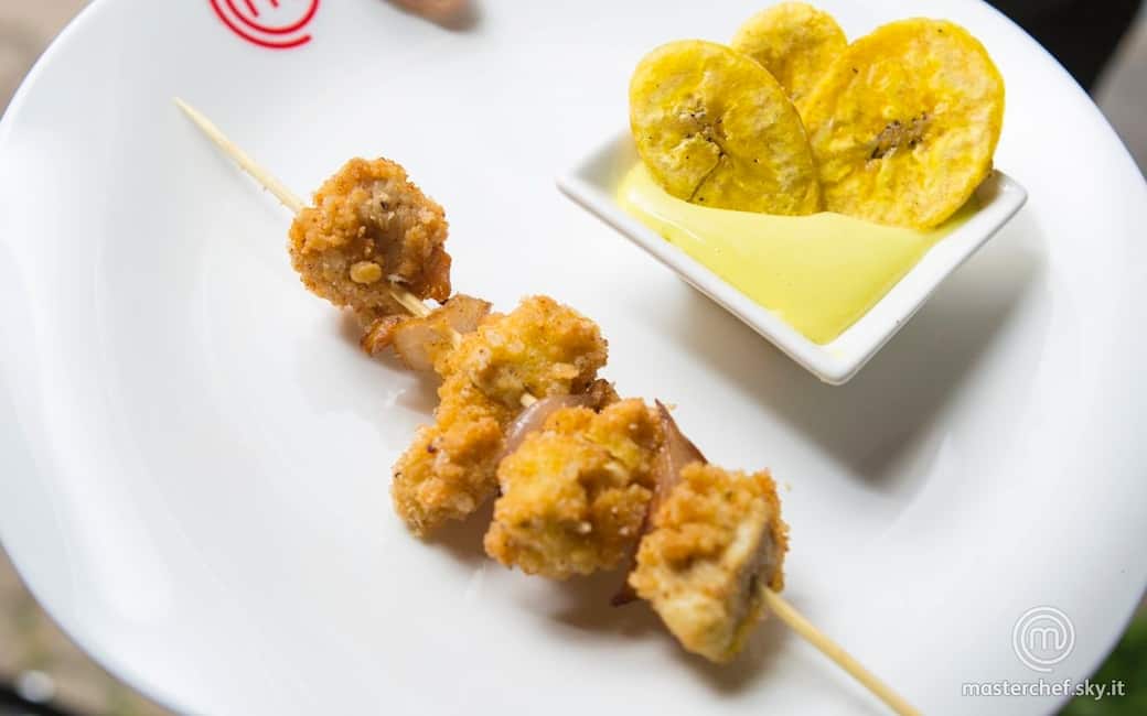 Spiedini di pollo fritto marinato nel lime con platano fritto e maionese al coriandolo