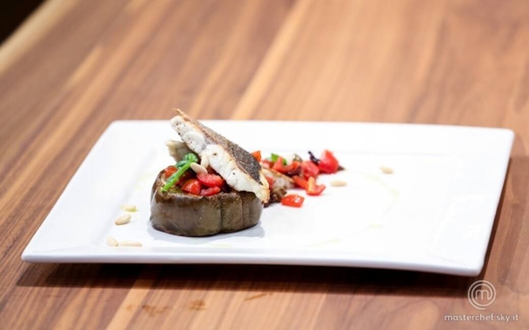 Impiattare mettendo alla base lo zoccoletto di melanzana, poggiarvi sopra il trancio di spigola e a fianco la concassé. Decorare con basilico fresco.