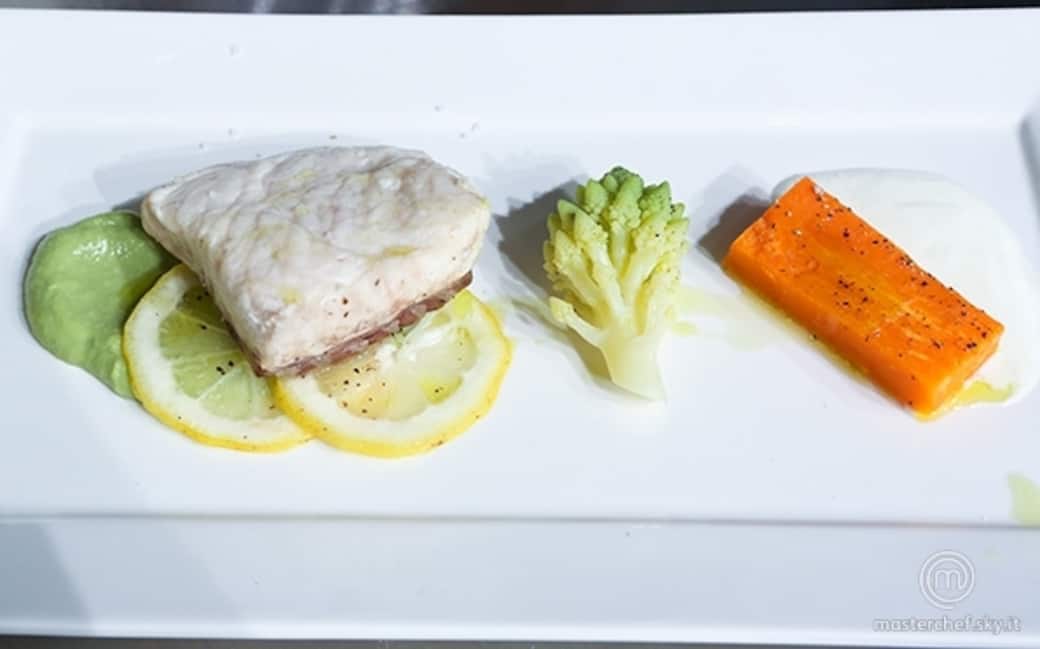 Impiattare il pesce su due fette di limone con una passata di salsa all'avocado e cocco. A fianco, adagiare la patata sotto a un cucchiaiata di panna acida. Aggiungere una cima di cavolo romano bollita e terminare il piatto con un giro di olio evo sul pesce e una spolverata di pepe.
