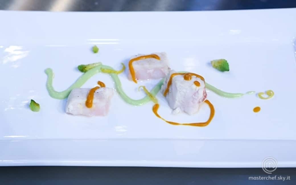 Impiattare creando nel piatto un'onda di guacamole, aggiungere tre cubi di storione, adagiarvi sopra la crema di patate e un ricciolino di zest di limone. Terminare il piatto con qualche cimetta di cavolo romano.
