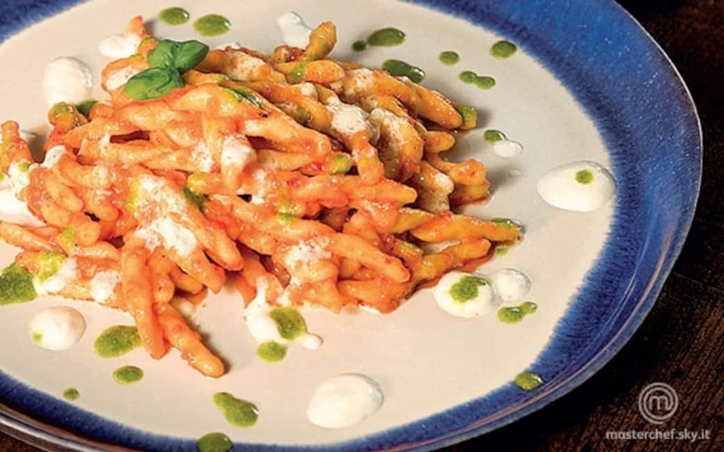 Cuocere la pasta in abbondante acqua salata e nel frattempo tagliare la burrata a dadini, avendo cura di conservare tutta la panna che fuoriesce. Scolare gli strozzapreti al dente, trasferirli in una padella e mantecarli con la crema di peperoni e un po’ di panna. Fuori dal fuoco, aggiungere i dadini di burrata e continuare la mantecatura.