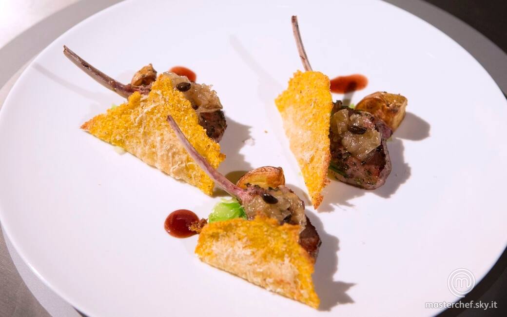 Comporre il piatto mettendovi tre costolette di agnello con sopra ognuna un cucchiaio di composta di cipolle e un chicco di caffè. Appoggiare accanto ad ogni costoletta una cialda di polenta e mettervi accanto una patata e un cucchiaino di riduzione del fondo al vino rosso.