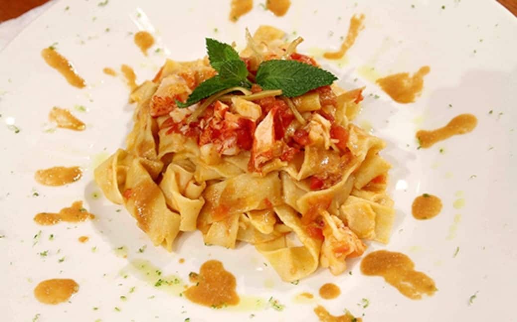 Tirare una sfoglia sottile con farina e uova. Arrotolare la sfoglia su se stessa e formare delle tagliatelle larghe 1 cm. Spolverizzare con farina, scompigliare e lasciare asciugare. Riportare ad ebollizione l’acqua di cottura dell’astice e buttarvi dentro le tagliatelle, che dovranno essere scolate ancora al dente. Versare queste ultime nella padella con la salsa, unirvi metà dello zenzero candito e fare saltare il tutto per 2 minuti, aggiungendo se necessario qualche mestolo di acqua di cottura.