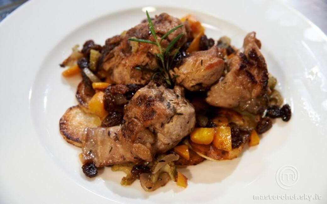 In una boule mettere le patate tagliate a rondelle, un filo d’olio, un pizzico di sale e un rametto di rosmarino. Adagiare le patate in una padella calda e coprire. Impiattare: disporre nel piatto le patate e sopra il coniglio e le verdure. Aggiungere un rametto come guarnizione e servire.