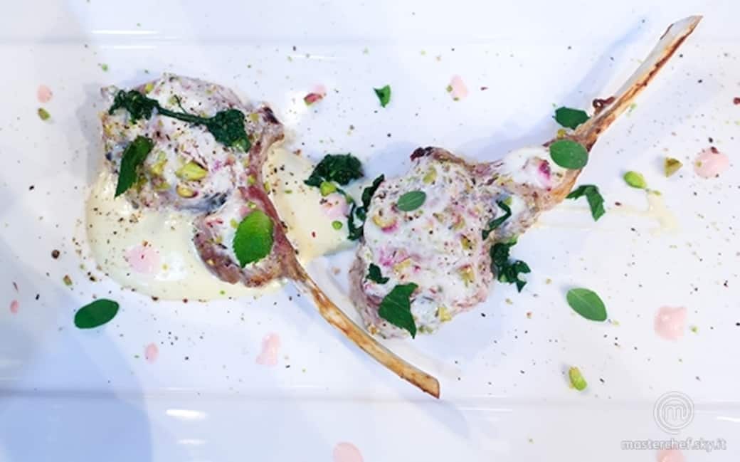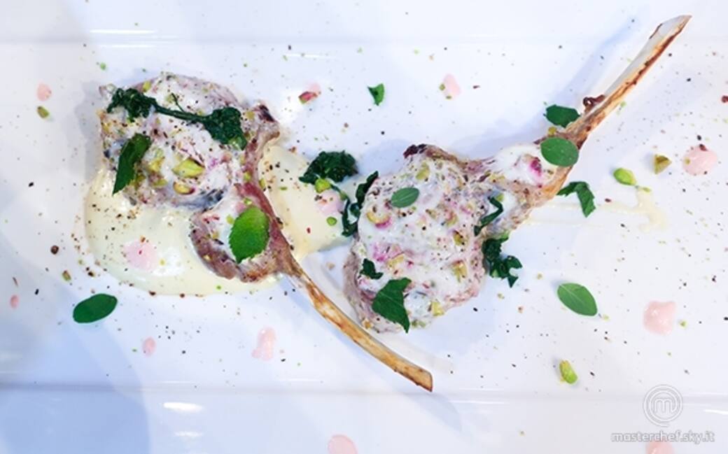 Su un piatto rettangolare, fare una striscia di mayo al rabarbaro, adagiarvi le costolette e guarnire con foglie di menta e di maggiorana, qualche goccia di crema rosa, pistacchi tritati, la cialda, pepe e olio evo.