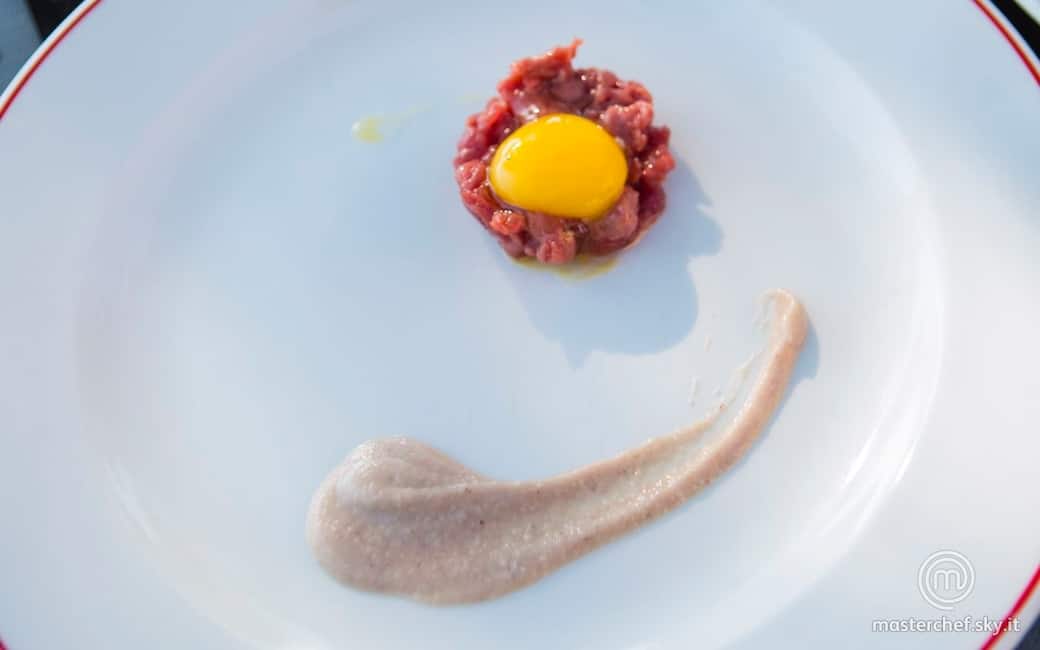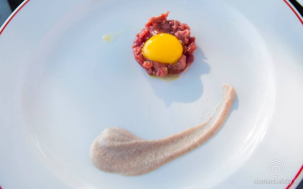 Impiattare una striscia di crema di castagne, una porzione di tartare e un tuorlo. Aggiustare di olio evo, sale e pepe.