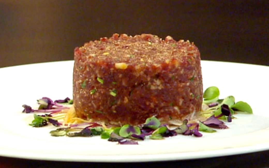 Mischiare la tartare con metà di pinoli tritati e erba cipollina. Inserire in un coppa pasta la tartare e adagiare sul letto d'insalata. Spargere i pinoli, rimuovere il coppa pasta e servire.