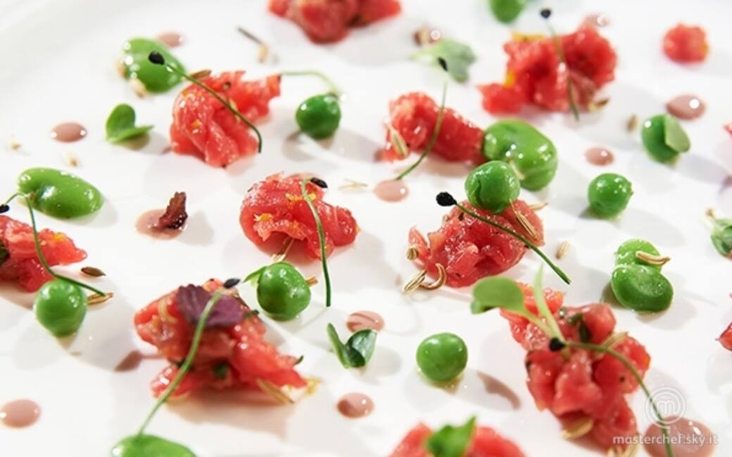 Mettere in una bastardella due tuorli d’uovo e due mezzi gusci di Gutturnio, poi creare una sorta di zabaione cuocendo a bagno maria. Disporre la tartare, lo zabaione al Gutturnio, le fave e i piselli e guarnire con germogli.