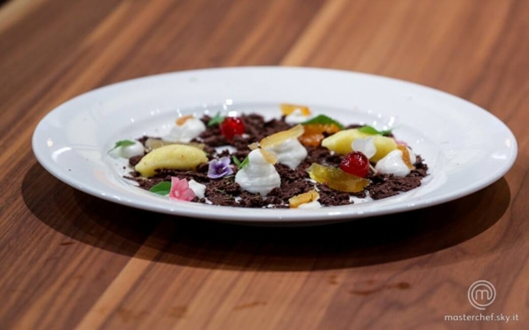 Impiattare spolverando il piatto con la terra al cioccolato, dei punti di spuma alla ricotta, su ognuna mettere un pezzetto di candito diverso a scelta, foglie di menta al cioccolato, fiori e due quenelle di sorbetto all'ananas. Finire con 2 pezzi di mostarda piccante mantovana.