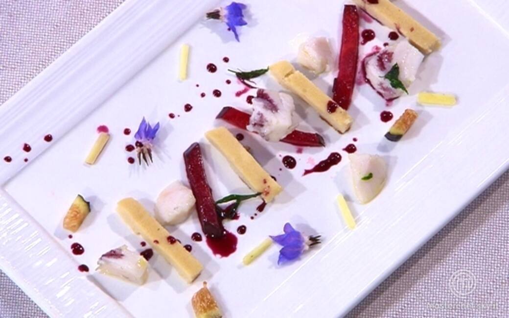 Impiattare in un piatto rettangolare la terrina di pesci tagliata a listarelle in modo casuale mettere le verdure e la frutta e macchiare con l'aiuto di un contagocce sul il piatto la riduzione di Gutturnio. Aggiungere i fiori di borragine per decorare il piatto e germogli di basilico rosso erba cipollina e zucchina