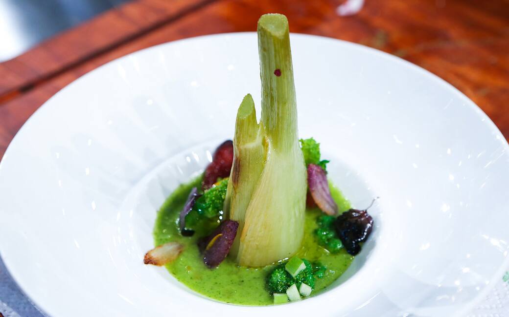 Impiattare disponendo alla base del piatto la scarola liquida, il finocchio glassato e salato al centro, i petali di pomodoro alla base, le foglie di cipolla fritta, le cime di rapa, foglie di basilico viola e scorze di arancia. Irrorare leggermente con olio evo.