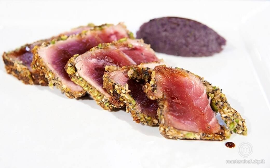Dividere l'albume dal tuorlo, poi montare leggermente gli albumi fino a farli amalgamare. Unire il sesamo, i semi di papavero, i pistacchi tritati, il pangrattato e mescolare il tutto per creare la panatura del tonno.