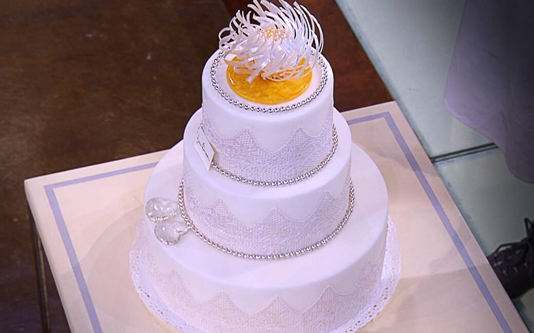 Assemblare la torta iniziando a rifilare il pan di spagna da tutta la crosta, rendendolo di colore chiaro. Tagliare ogni strato in due parti e spennellare con la bagna, bagnando meno, o non bagnando addirittura il primo strato, per facilitare la manipolazione del dolce. Farcire con crema pasticcera, quella più utilizzata è quella al burro, e continuare così la lavorazione fino all’ultimo strato di pan di Spagna. Ricoprire di crema al burro di colore bianco e con moderazione, senza che si veda il pan di Spagna. Stendere la pasta di mandorle o la pasta di zucchero sottile-sottile, massimo due millimetri. Ricoprire tutto il dolce senza far fare una piega in superficie o di lato, o formare bolle d’aria, rifilare il marzapane con una ruota tagliapasta o con un coltellino tutto il bordo. Spolverare leggermente la superficie di zucchero velo e girare sopra il piano della torta e sul bordo con un disco di cartone per livellare il dolce. Se posizionate la torta frigorifero per poco tempo vi faciliterà la lavorazione successiva, se rimane troppo al freddo la crema al burro produce condensa, bagnando, poi la pasta di mandorla o di zucchero. Le paste ricoprenti possono spruzzare di colore, oppure si colorano prima di utilizzarle. Il pizzo è fatto con gli stampi della Pavoni Magic Decor che velocizzano e rendono elegante la torta ed hanno lo zucchero particolare per fare i pizzi.