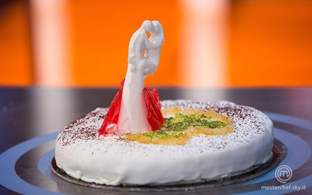 Tagliare il pan di spagna e farcirlo con la crema pasticcera, coprirlo con la crema al burro e la pasta di zucchero stesa. Decorare con gli sposi, le foglie di isomalto e i pistacchi tostati cosparsi di cacao.