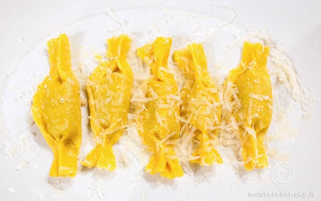 Preparare un impasto con uova, farina e lasciar riposare coperto. Tirare la pasta molto sottile, disporre il ripieno e coprire con un secondo strato di pasta. Tagliarla con la rotella e chiuderla formando delle caramelle. Cuocere i tortelli in acqua bollente salata per 5 minuti, scolarli e irrorare con il burro fuso in cui è stata aggiunta una punta di miele.