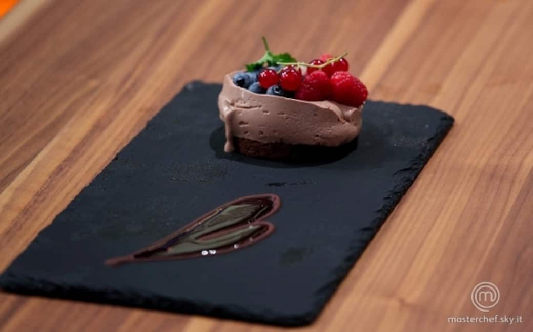 Impiattare mettendo la salsa alla base, il tortino sopra e decorare con frutti di bosco freschi e foglie di menta.