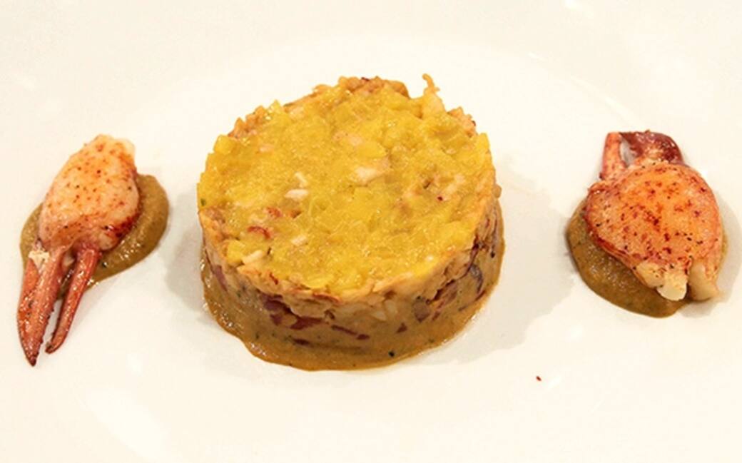 Impiattare, aiutandosi con un coppa pasta, facendo una base con la salsa all’astice, uno strato di insalata di pomodori e cipolle, uno strato più spesso di polpa d’astice tritata e ultimare con un sottile strato di mango saltato nel burro. Finire il piatto aggiungendo le due chele, anch’esse su una base di salsa all’astice, a lato del tortino.