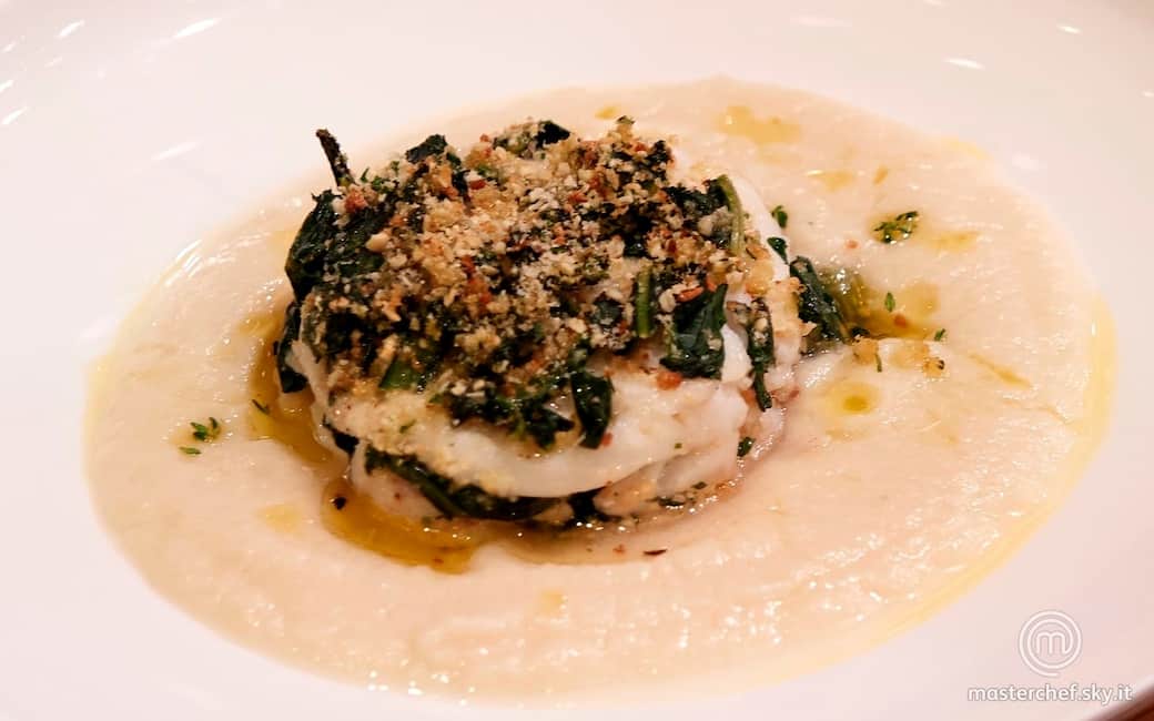 Frullare il pane con i pinoli e il prezzemolo e creare una panure. Alternare a strati il merluzzo, la cicoria e il pane aromatizzato formando un tortino.