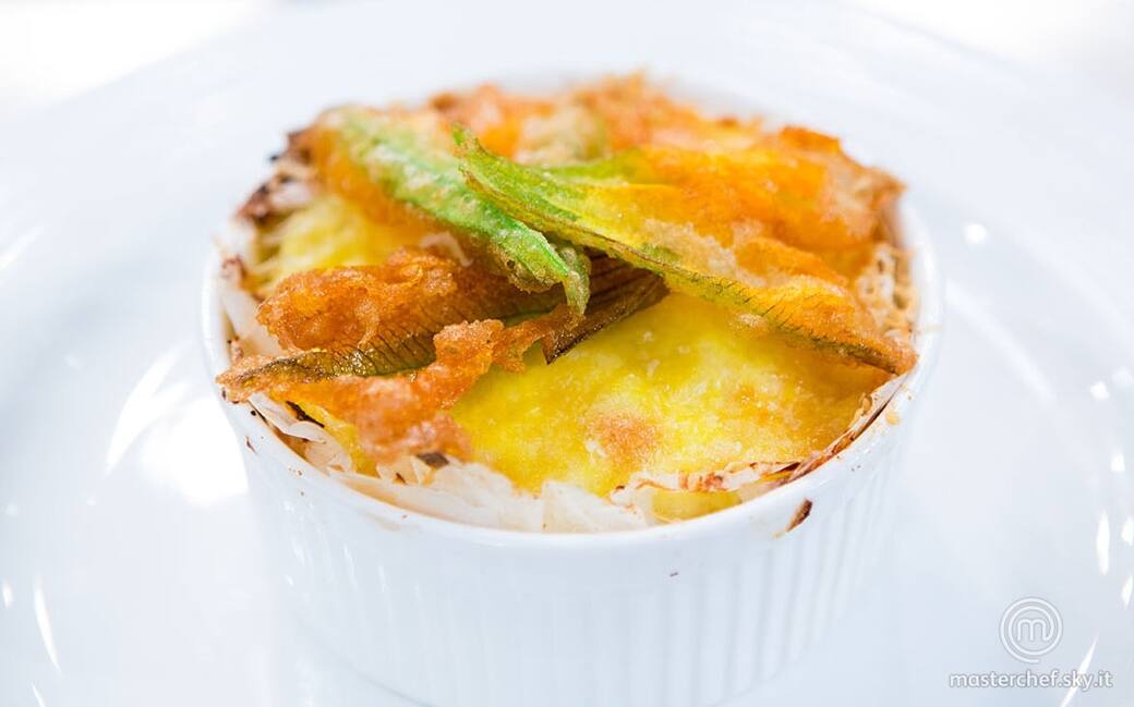 Sfilettare la sogliola e ricavarne una tartare, marinare in olio, sale e pepe. Posizionare la tartare sul tortino e infornare. Dopo 1 minuto sfornare il tortino e posizionare i petali fritti in cima al tortino.