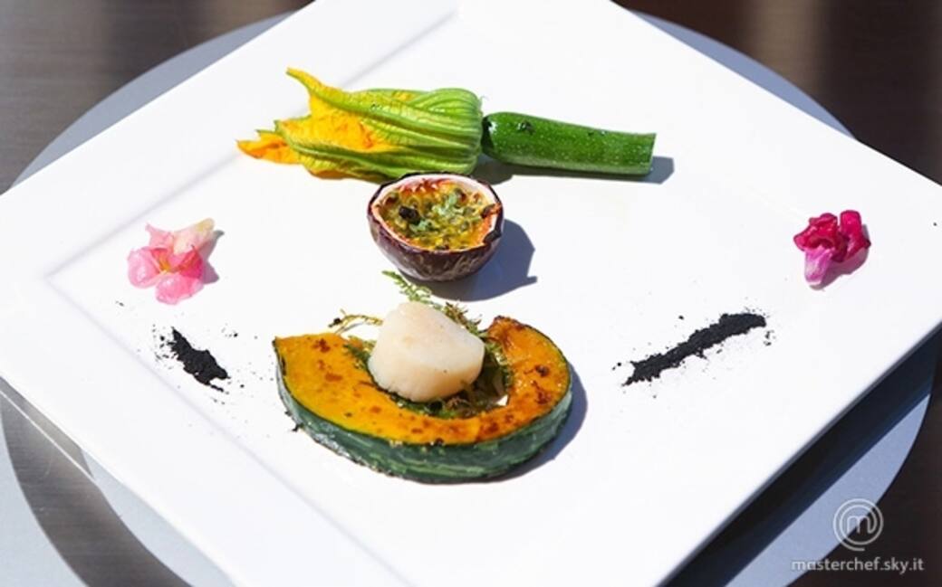 Scottare la capasanta in padella per circa 3 minuti per lato adagiatela nel piatto sul muschio lessato e il basilico. Impiattare la zucca al lato. Togliere il pistillo al fiore di zucca e riempirlo con il passion fruit e i tartufi di mare. Usare la canna bruciata come decorazione.